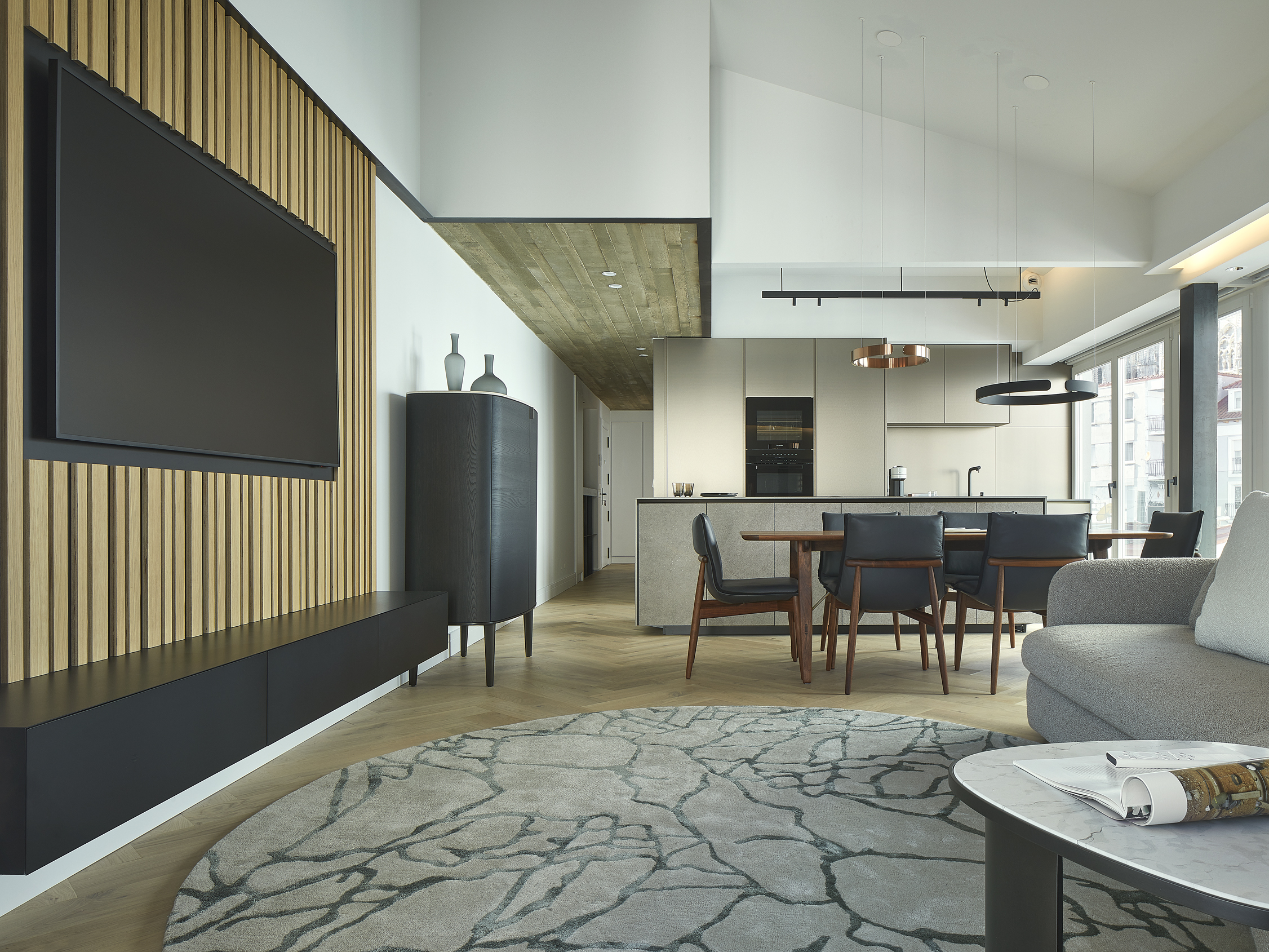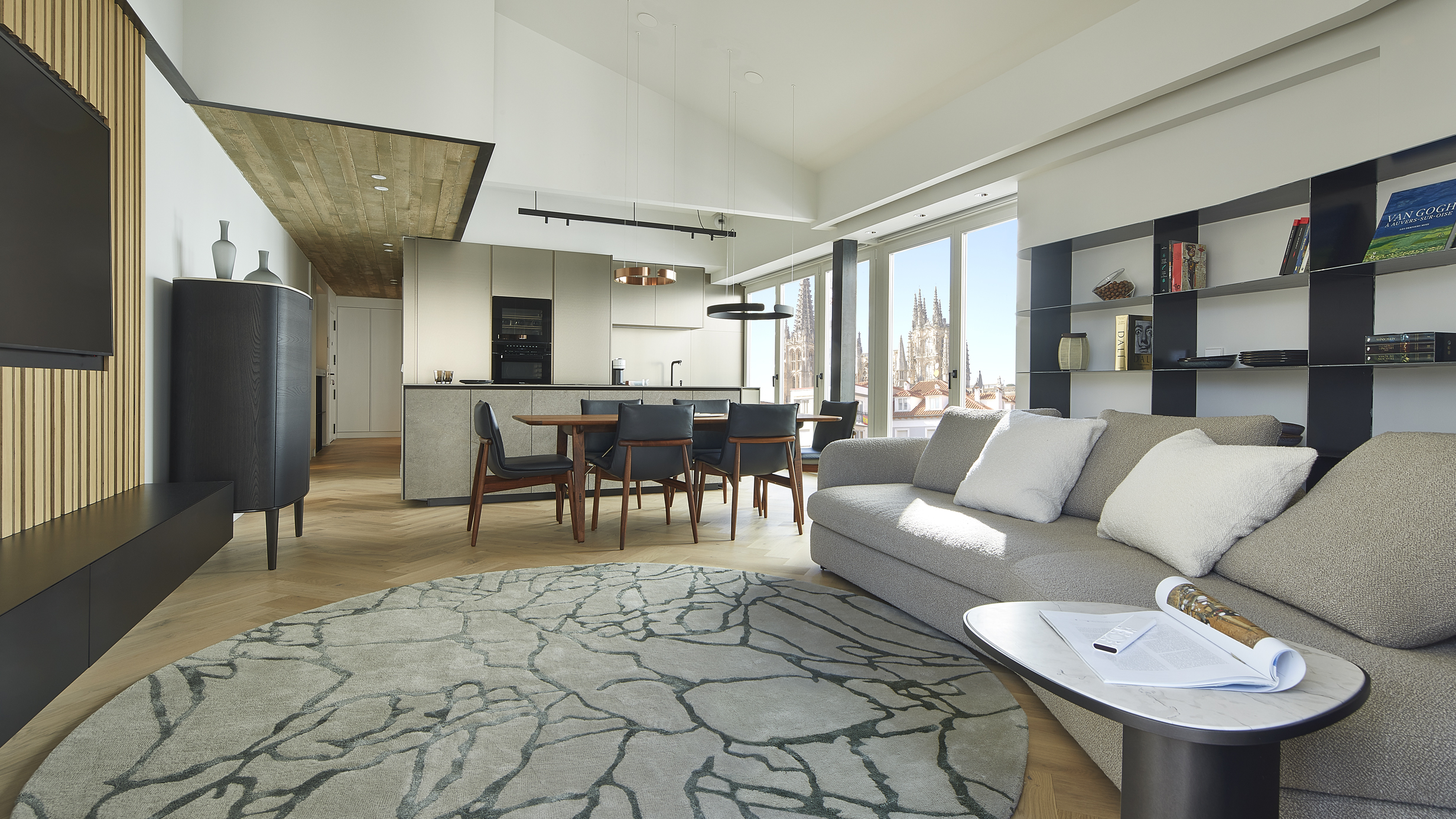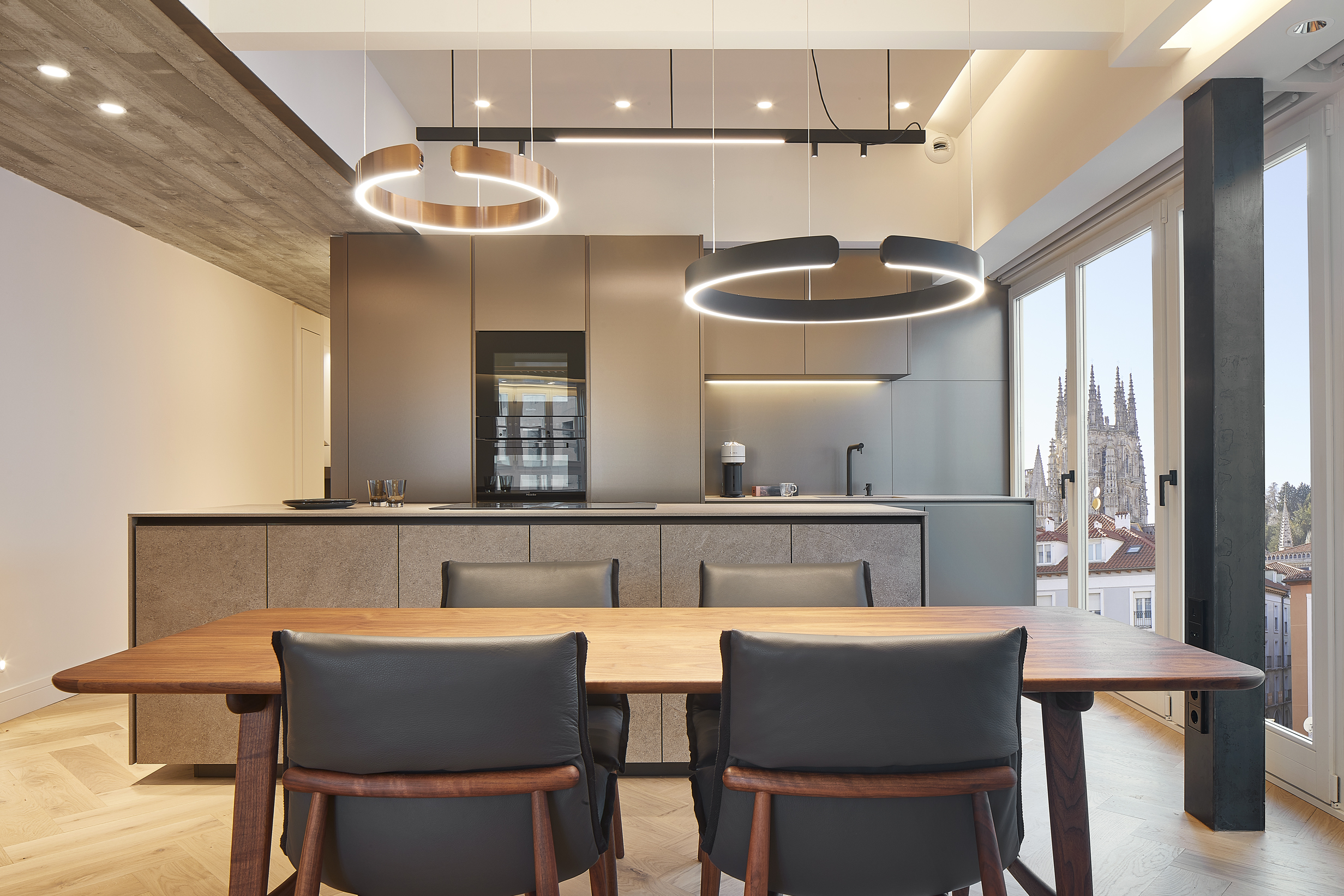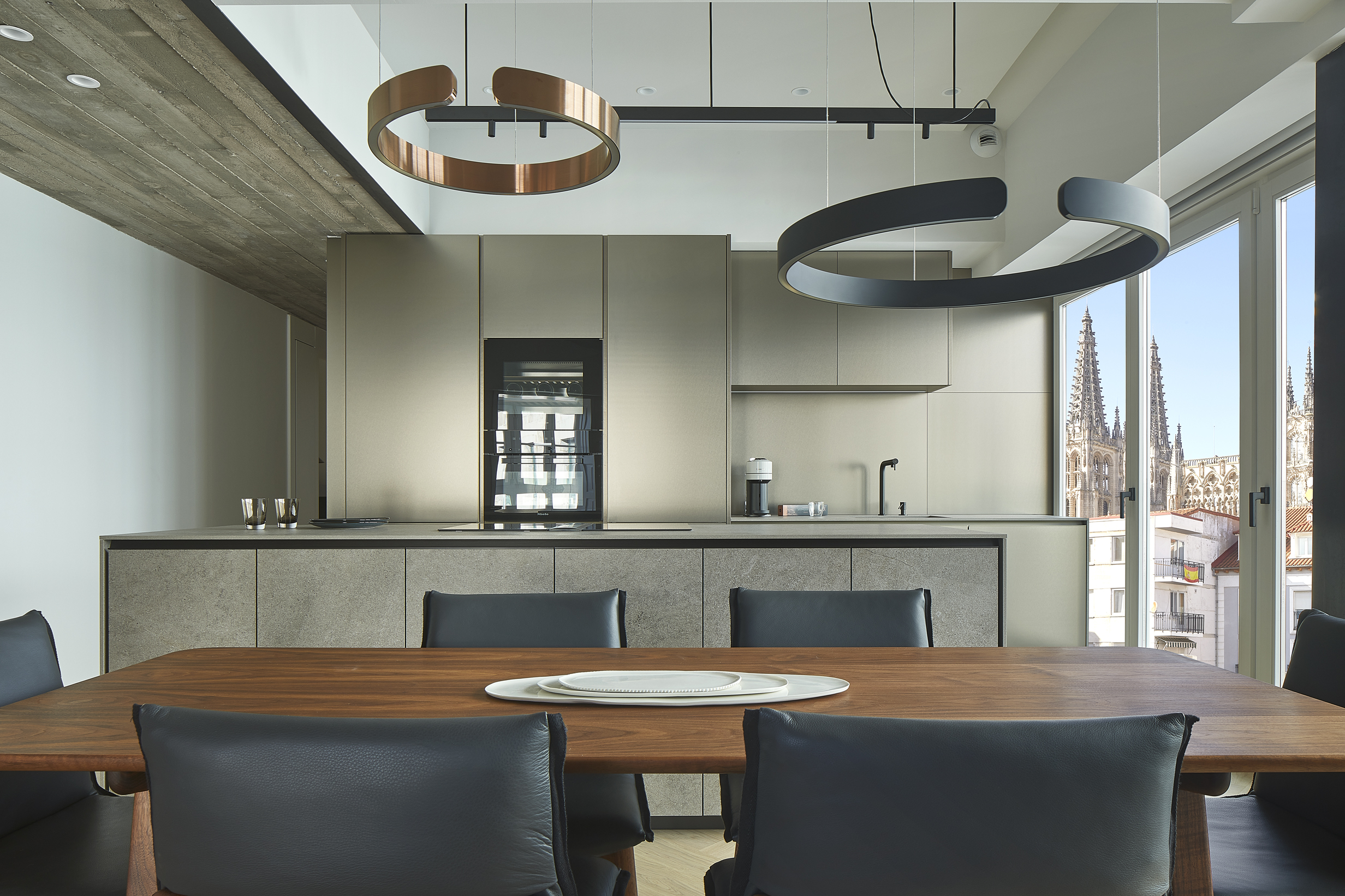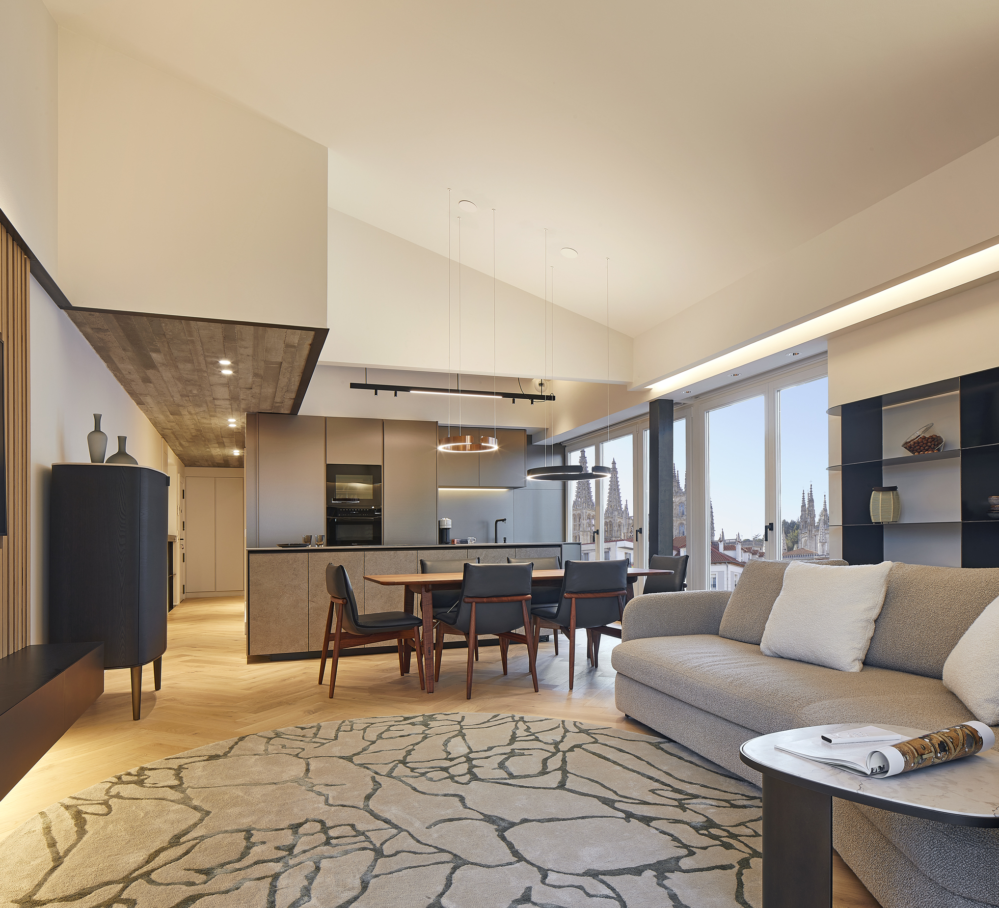 La relación entre el interior y el exterior del piso, in primis la espectacular vista hacia la Catedral, nos ha empujado hacia una composición atemporal, investigando y utilizando materiales y tonalidades que visualmente fluyan hacia el exterior.