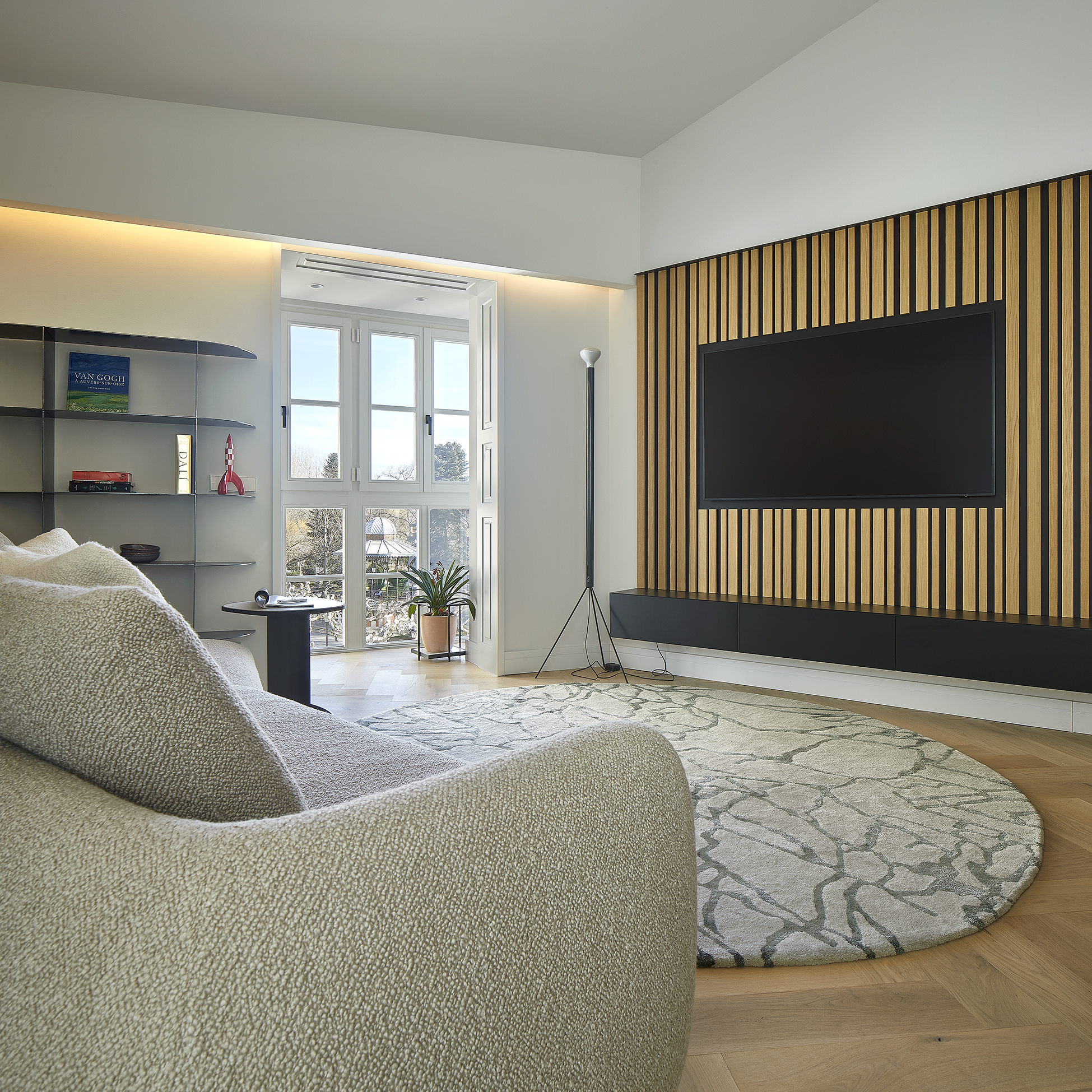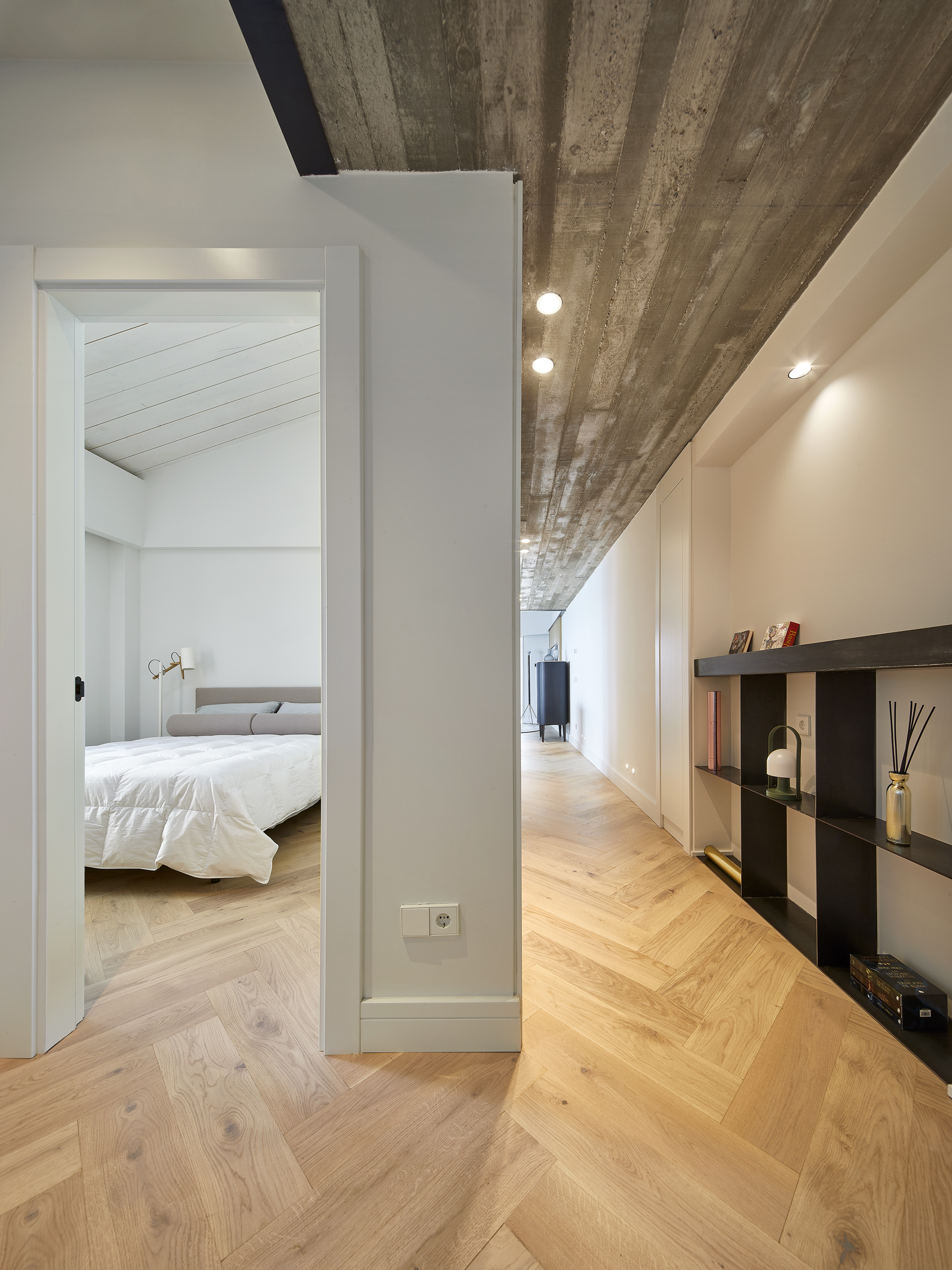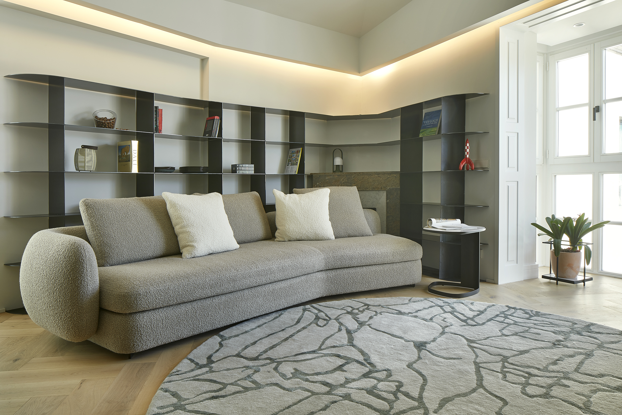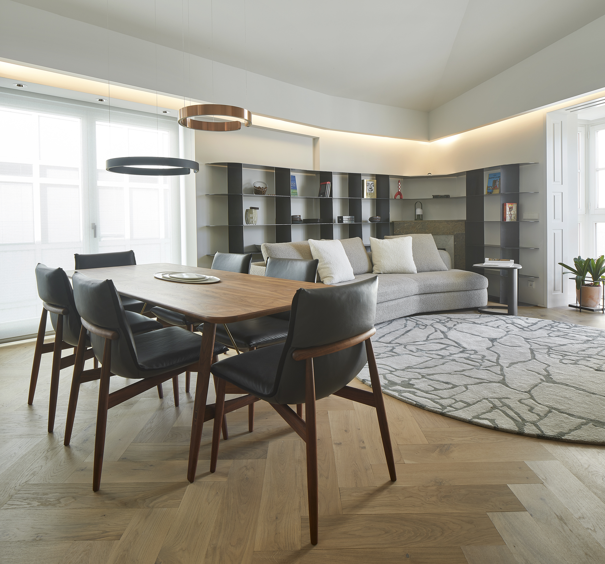 La planta presenta una geometría irregular a la que hemos ido adaptando las distintas piezas de mobiliario, algunas, como la librería metálica y el mueble para la televisión, hechas a medida.