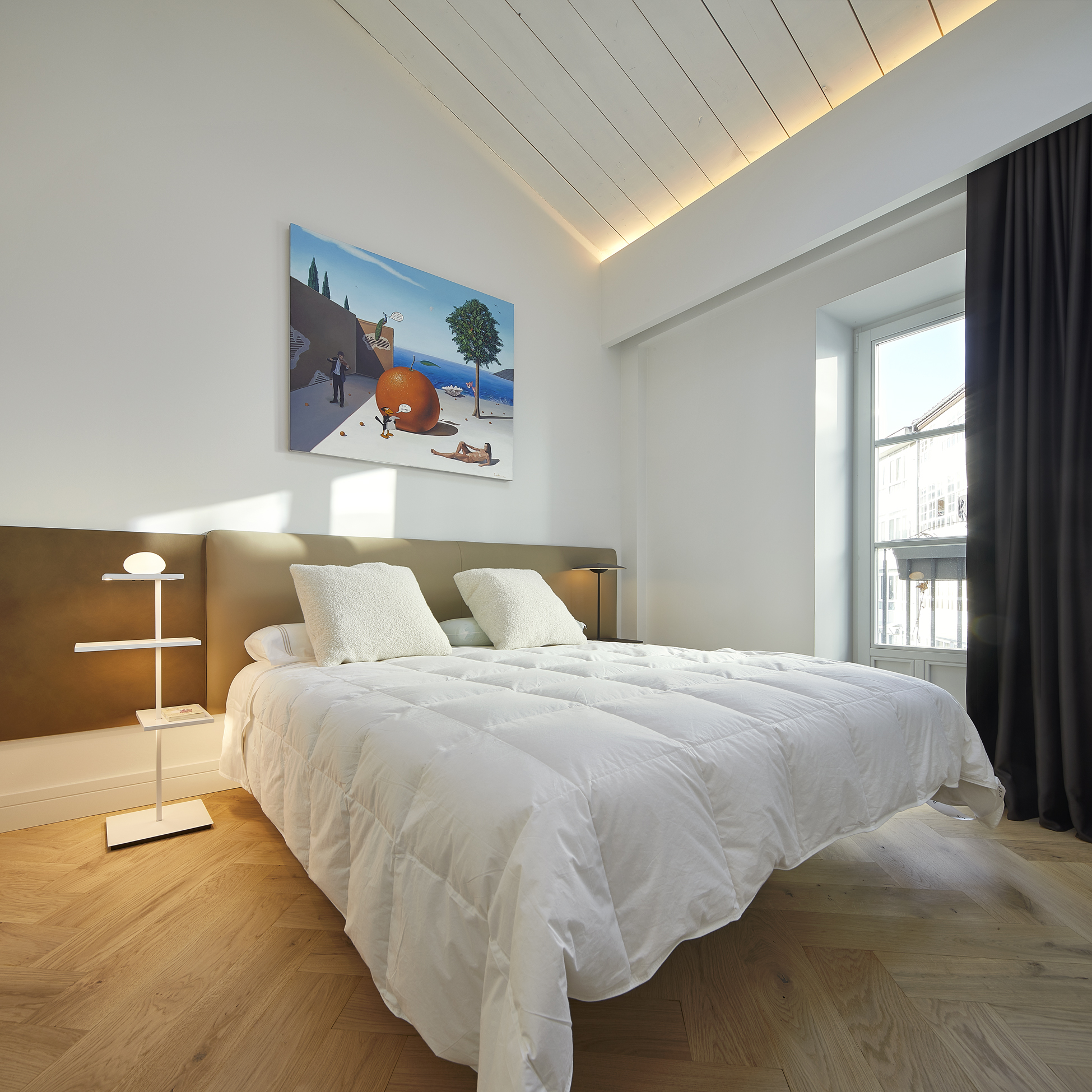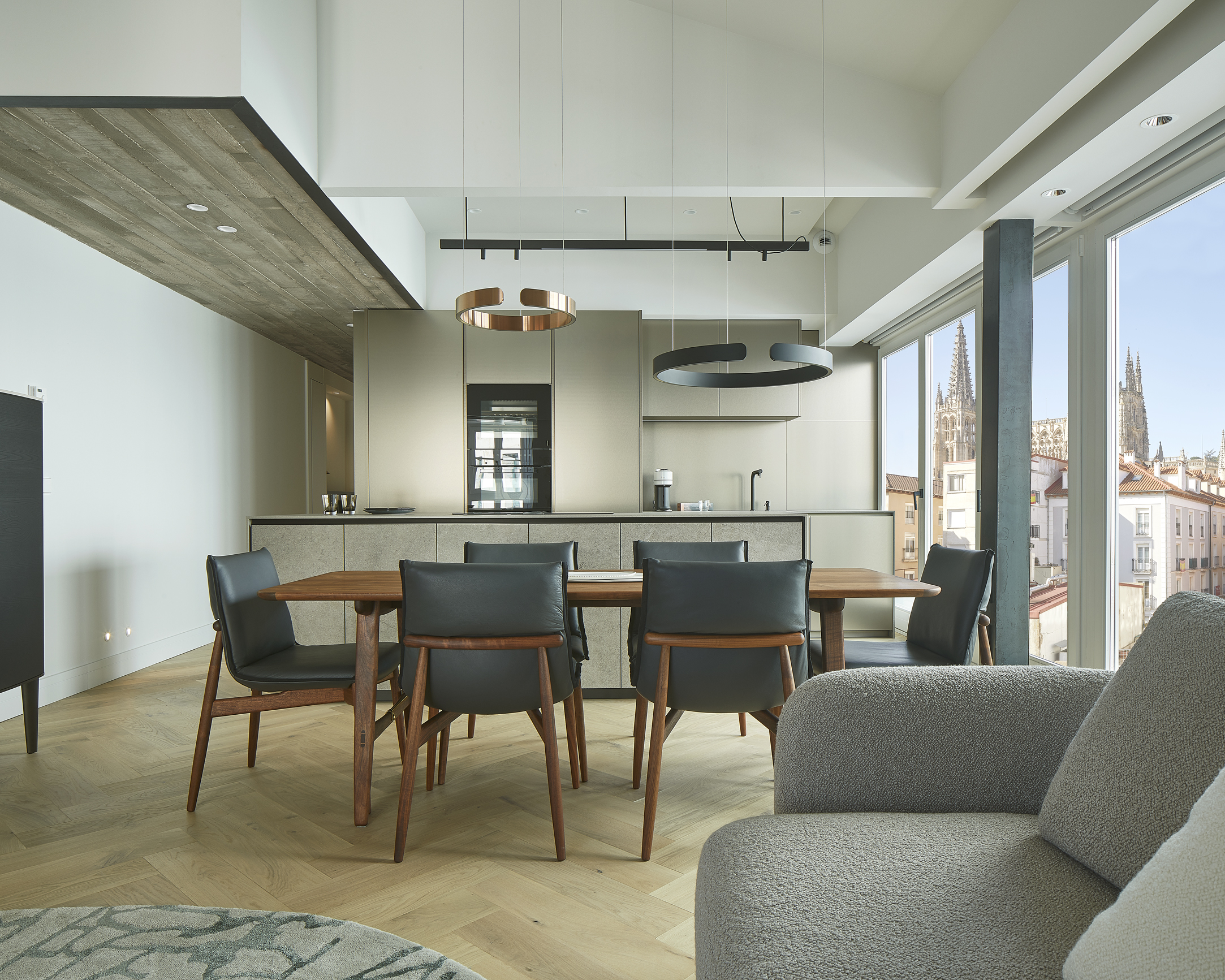 Así nos encontramos, que al piso se accede a través de la zona noche (una habitación suite, una habitación doble y un lavabo) y atravesando el pasillo de distribución, se llega a la zona de día, que reúne en un único espacio la cocina, el comedor y el salón. Esta sala tiene vistas privilegiadas hacia la Catedral de Burgos y hacia al Paseo Espolón, lateral al rio Arlanzón.