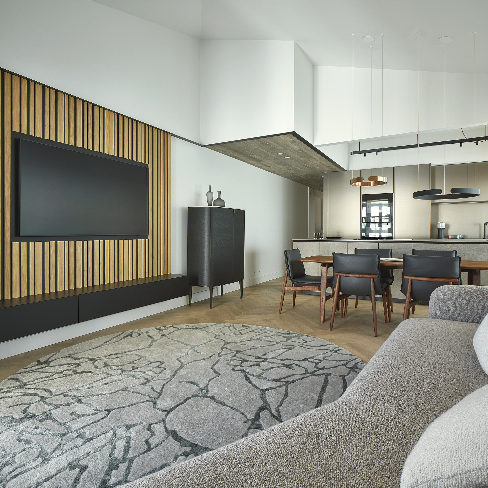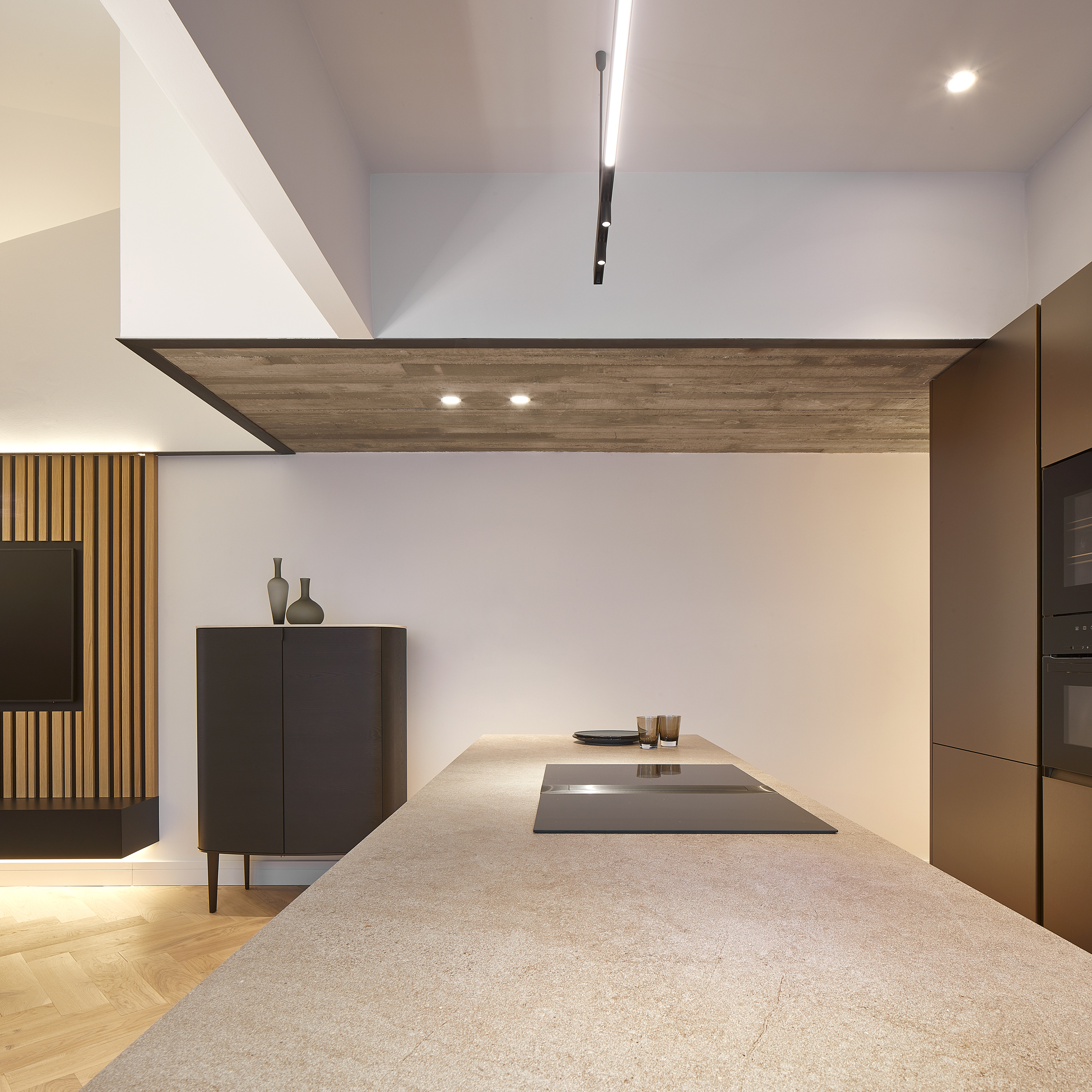 Se ha buscado el equilibrio y la convivencia entre los materiales preexistentes en la obra (hierro, hormigón, madera maciza de roble, aluminio, yeso) y los materiales utilizados en el proyecto (cerámica, resinas, hierro, madera, lana, algodón). Se ha priorizado el aspecto mate: la isla de la cocina se ha realizado como un volumen monolítico de piedra (por obviedades técnicas está compuesto por cerámica imitación piedra natural), los muebles altos y la fregadera con STM color Champagne (resinas acrílicas de nueva generación, endurecidas y fijadas mediante un proceso de Electron Beam Curing) efecto extra mate.