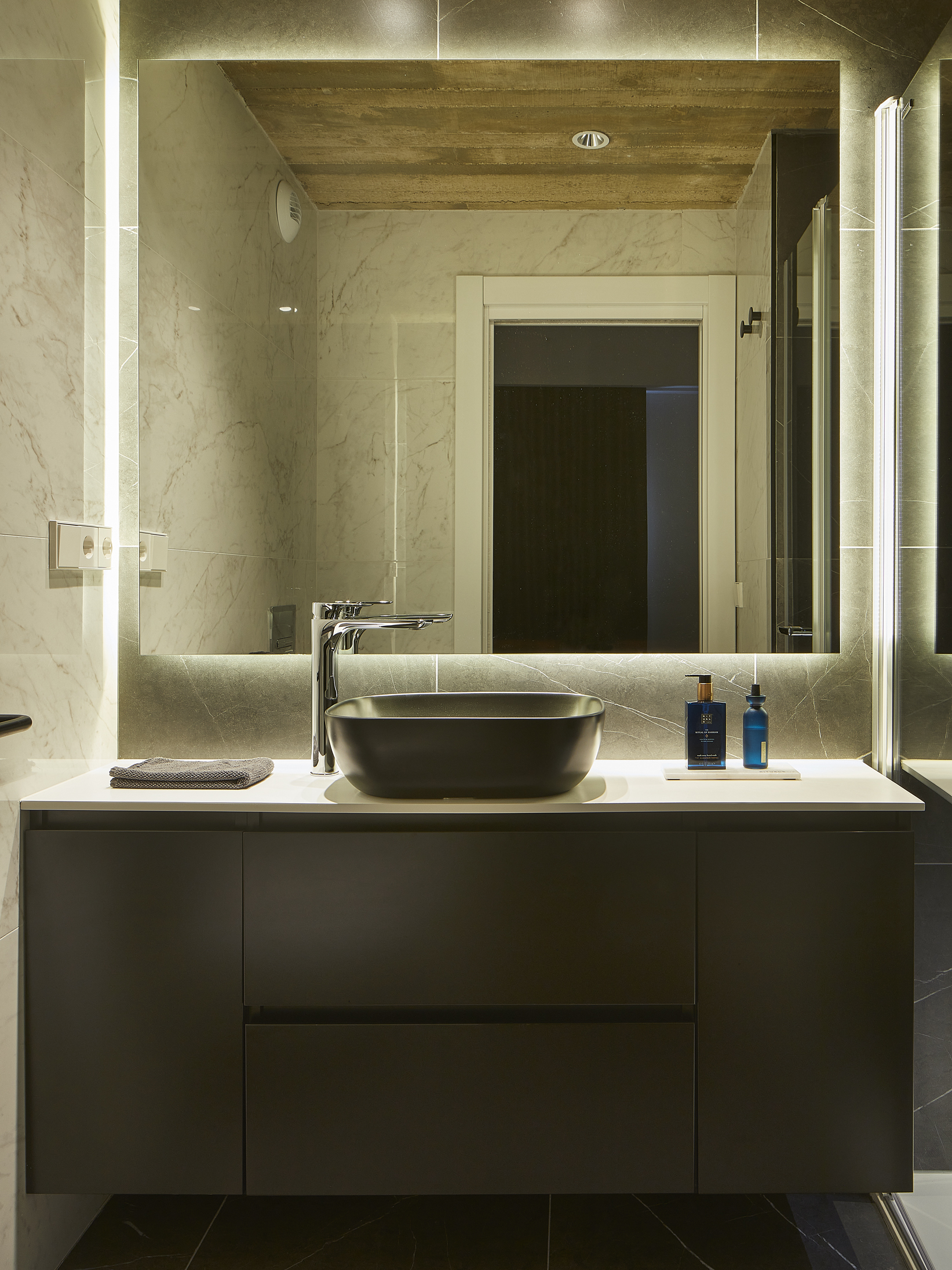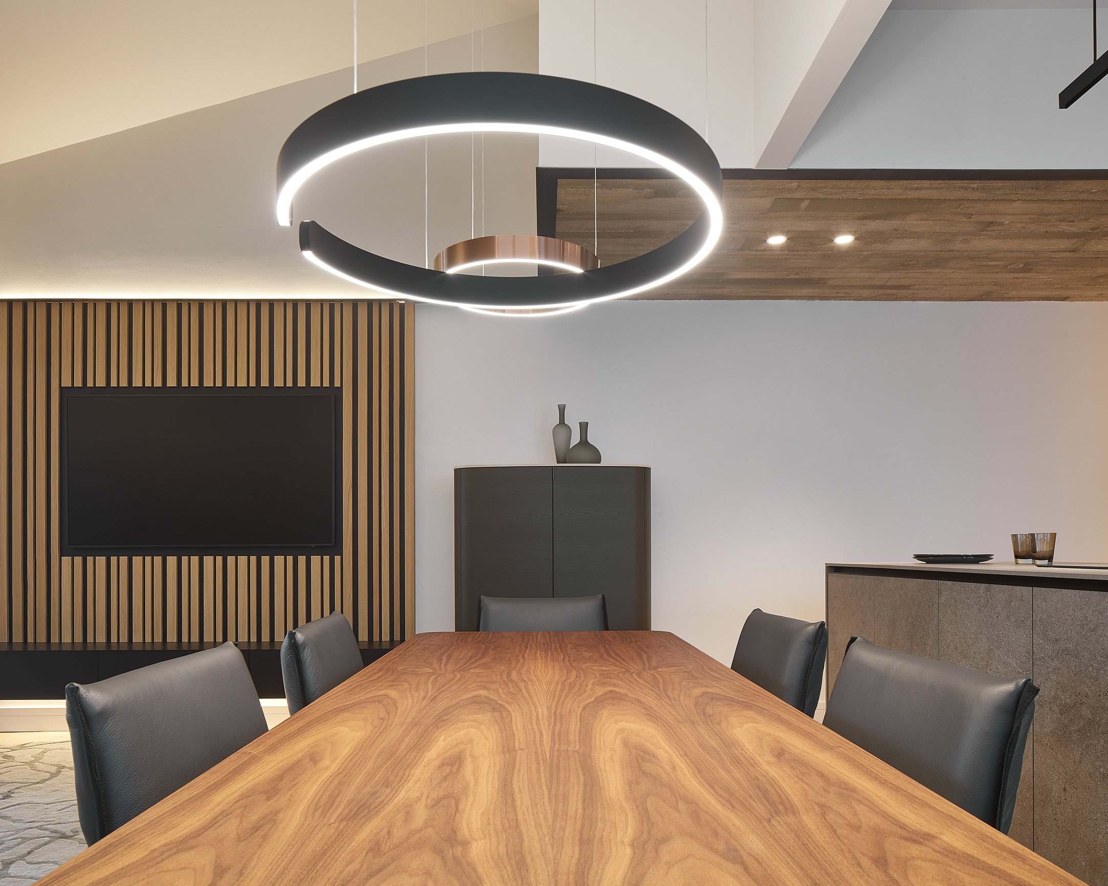 La iluminación se ha resuelto combinando luces indirectas en cortineros que dan una atmosfera cálida continua y luces directas decorativas en los espacios más necesitados.
